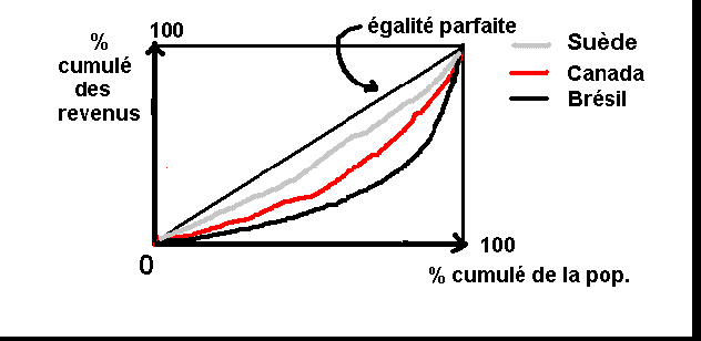 La courbe de Lorenz est un outil qui permet d’illustrer un certain profil de la répartition de la richesse à l’intérieur d’une économie. Il s’agit d’un graphique présentant la relation entre le pourcentage des revenus (axe des Y) et le pourcentage des familles. La courbe à 45 degrés illustre la situation ou la répartition de la richesse serait d’une équité absolue. La taille de la zone hachurée (qui s’agrandit à mesure que l’on s’éloigne de la situation parfaitement égalitaire) indique l’ampleur des inégalités dans une économie. On peut se servir de cette courbe pour comparer la répartition de la richesse entre différentes économies ou analyser son évolution dans le temps pour une économie. La figure suivante présente la courbe de Lorenz du Canada, du Brésil et de la Suède.