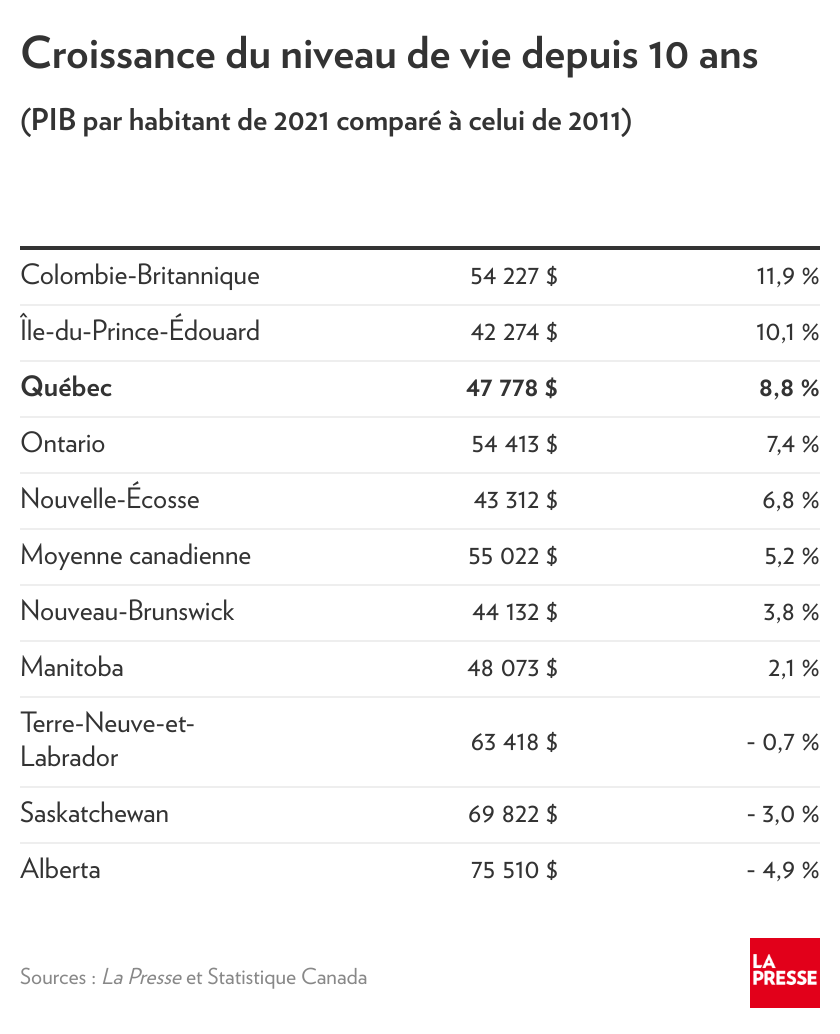 En 2021, le PIB/habitant du Canada se situait à 55 022 $ comparativement à 47 778 $ pour le Québec. Il est encourageant de voir que le PIB/habitant du Québec progresse plus rapidement que la moyenne nationale depuis 10 ans: on assiste donc à un certain rattrapage du niveau de vie des Québécois.